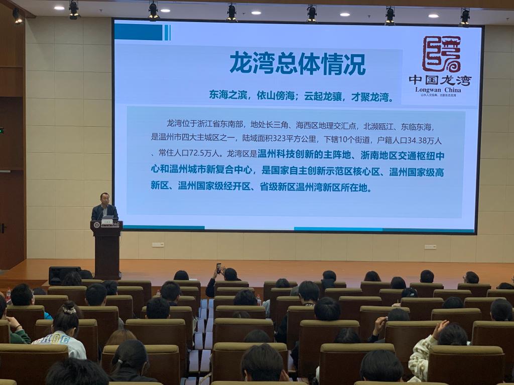 龙湾区人力资源和社会保障局王宋余副局长介绍区域优势、产业特点、当地创业政策,隆重向大学生推介龙湾区创业场地。