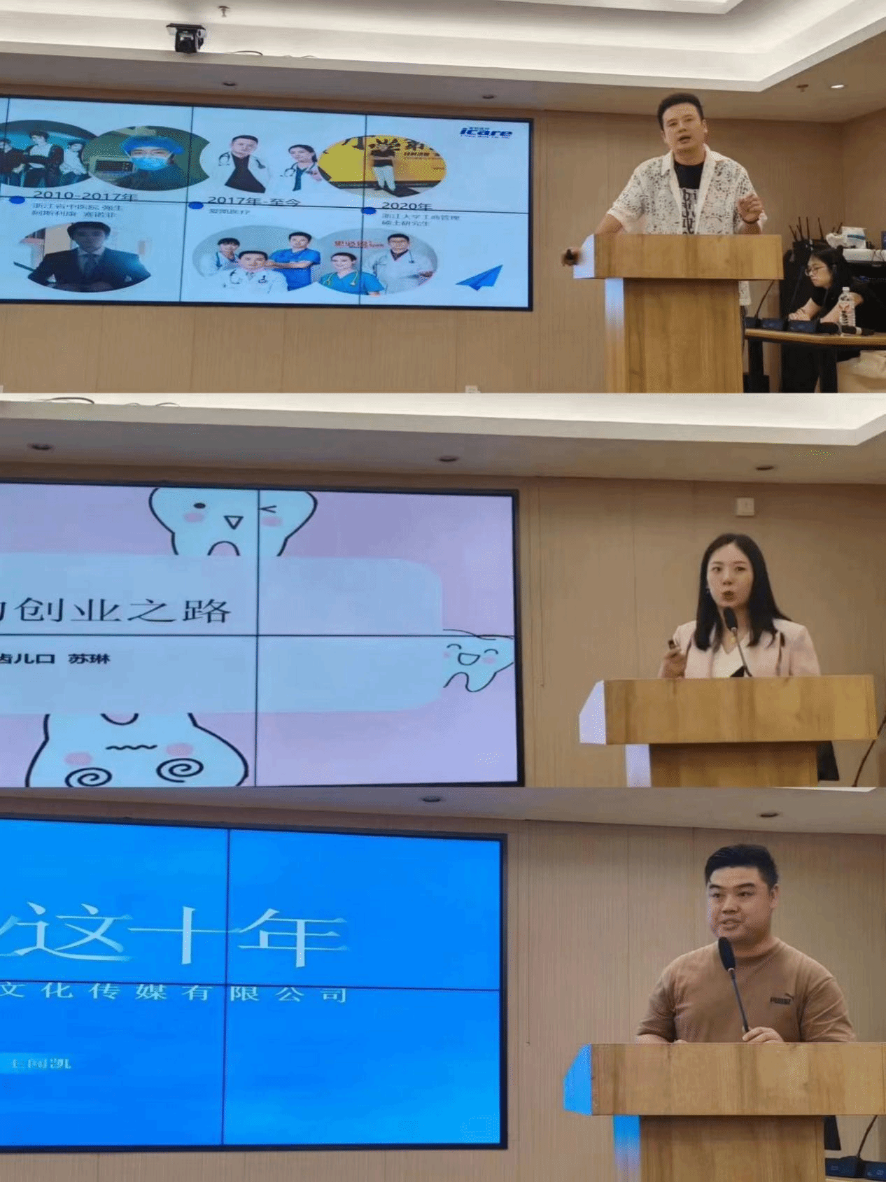 “年轻人要勇于尝试、丰富自己的经历,要整合自身资源优势做创业,”2010届临床医学专业校友、爱凯医疗创始人肖遥峰用心地描摹着自己的创业历程和品牌故事。“故事要从2015年大学生职业规划大赛开始说起......”2016届口腔医学专业校友、东齿儿口创始人苏琳向大家娓娓道来她“顺势而为”的创业道路。“改变我人生的两件事,一件是读书,一件是创业。”2013届市场营销专业校友、浙江本象文化传媒有限公司总经理王闻凯用质朴真诚的语言分享了自己创业这十年。这是红桃视频 创新创业精英班与校友办创业校友“与谈”共同构建的从“向新而行”到“向心而为”的创业对谈,是“新”的引领,更是“心”的传承。